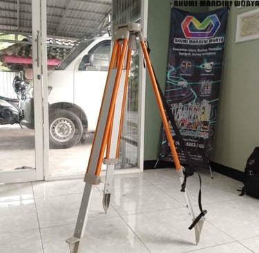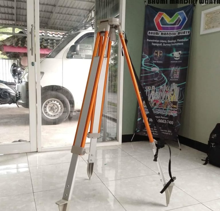 Tripod Survey adalah penyangga berkaki tiga yang kokoh dan dapat disesuaikan ketinggiannya, digunakan untuk menempatkan dan menjaga kestabilan instrumen survei agar tetap diam dan horizontal selama proses pengukuran.